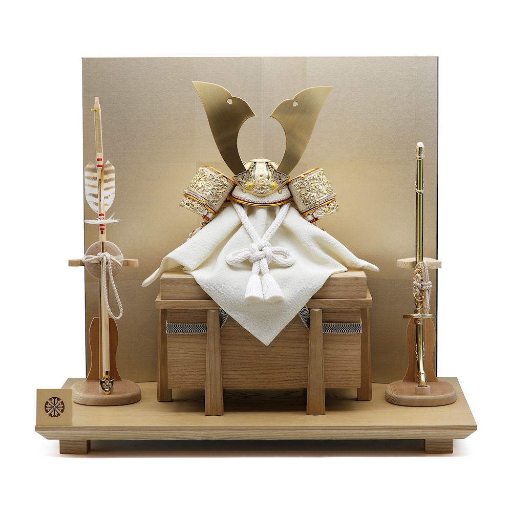 端午の節句らしい弓太刀は、飾り台や櫃に合わせて白木で製作した国産の弓太刀です。国内で製作される最高品質の品です。弓太刀には「魔除け」の意味、「社会が平穏であるように」という平和への願いが込められています。