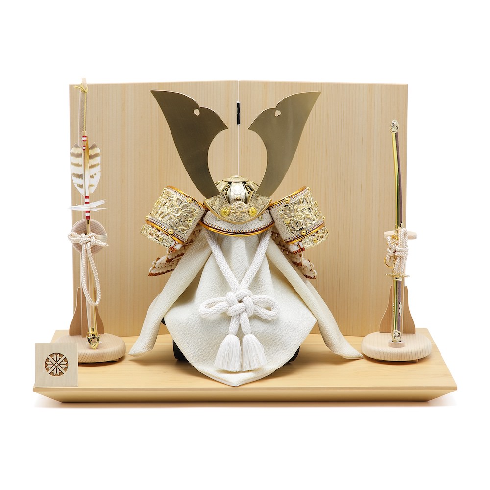 豪華で爽やかな白い兜を主役にした木目の温かみのある兜飾りです。