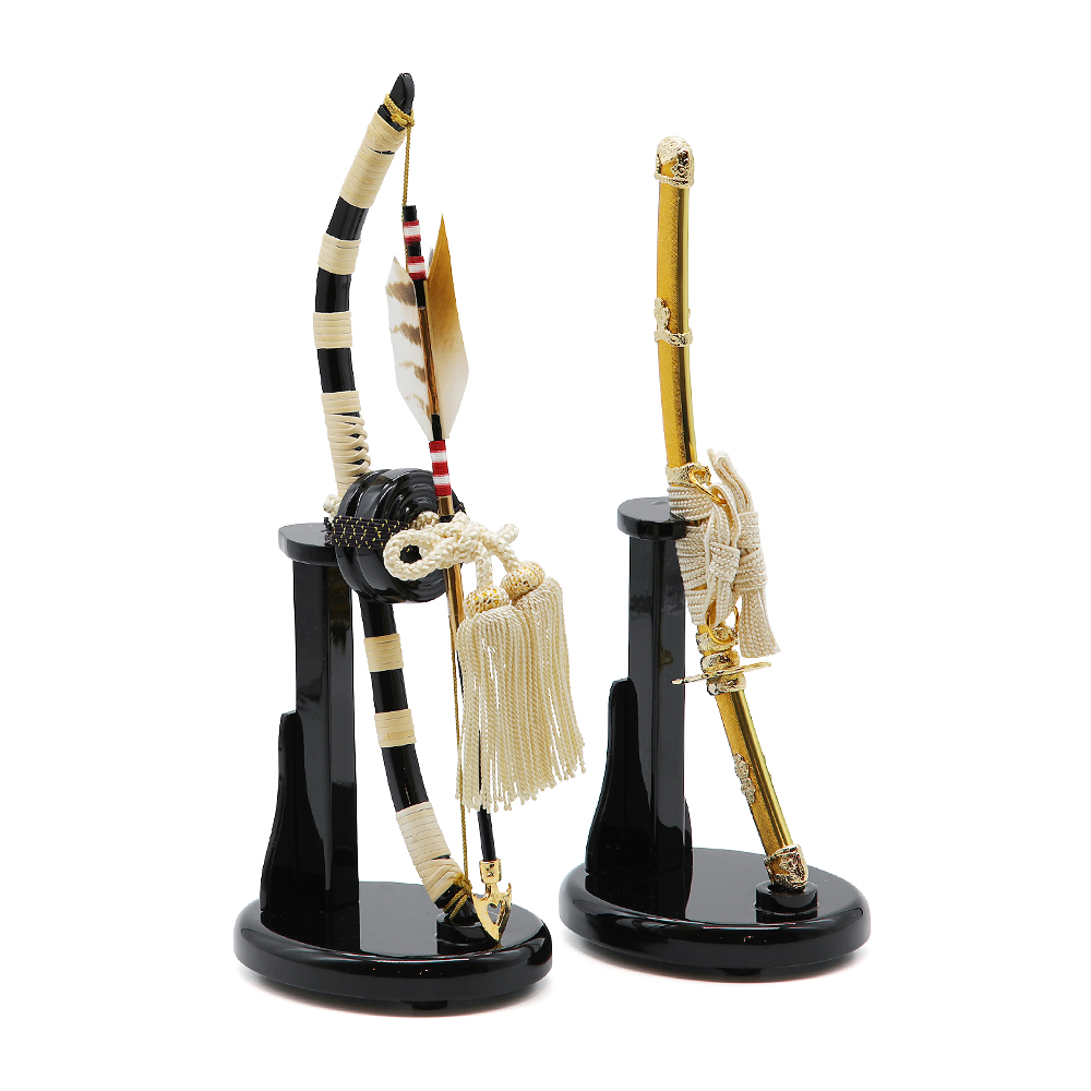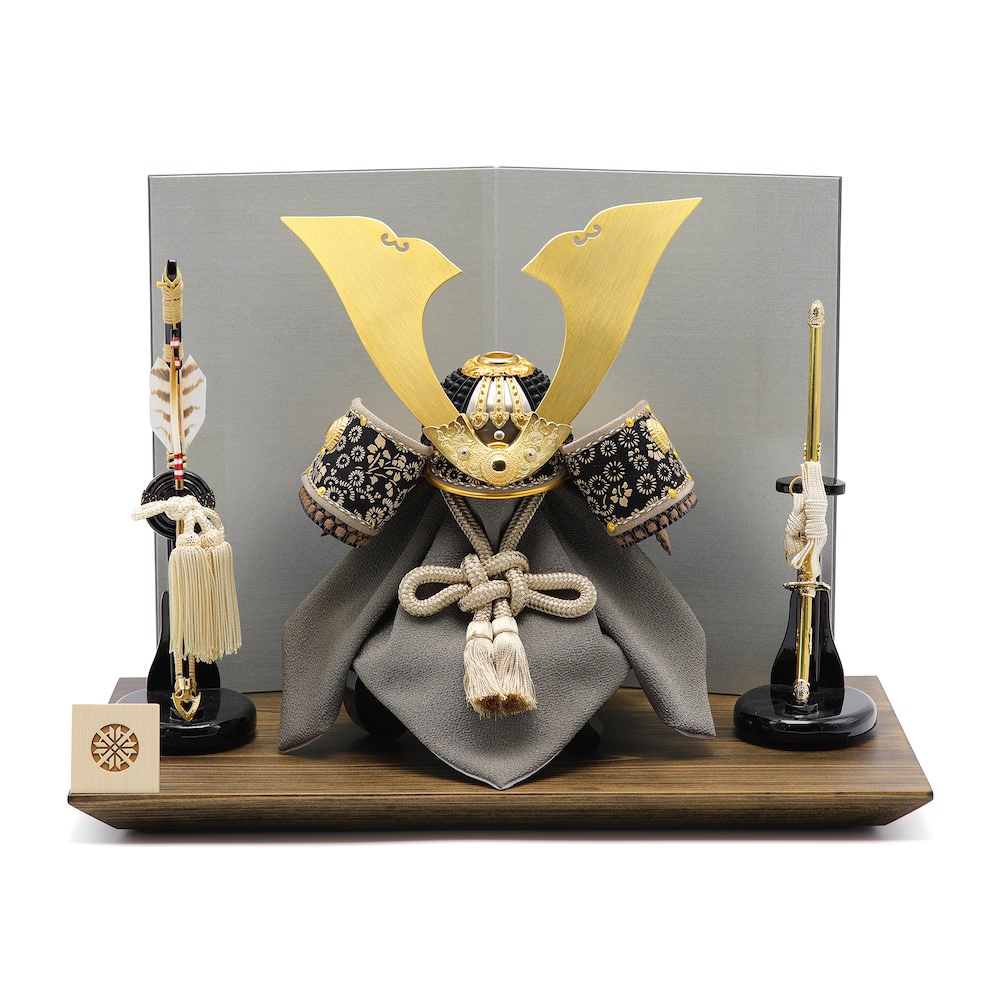 飾り台は、高岡漆器の高岡で製作した木目を活かし、漆を使って拭き漆の技法で仕上げたこだわりの国産飾り台。屏風は、現代的な銀色とごく薄い青の中間色のような光沢ある屏風。静岡県にて製作したこだわりの品です。兜の両隣には端午の節句らしく、男らしい国産の弓太刀を添えています。房や紐をベージュ色で製作した気品のある国内最高峰の品質の品です。弓太刀には「魔除け」の意味、「社会が平穏であるように」という平和への願いが込められています。拭き漆飾り台の厳かな雰囲気と屏風、弓太刀のモダンな雰囲気から上品でありつつも、新しさを感じる飾りに仕上がっています。