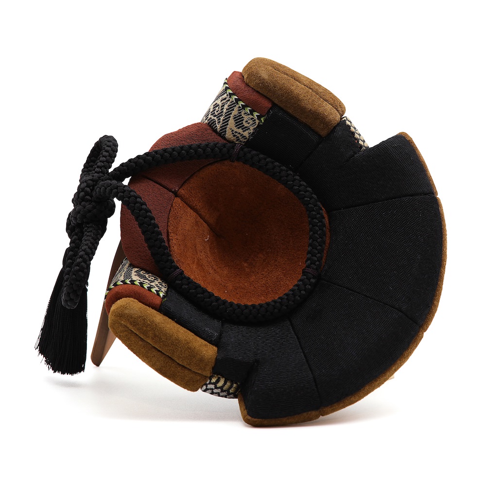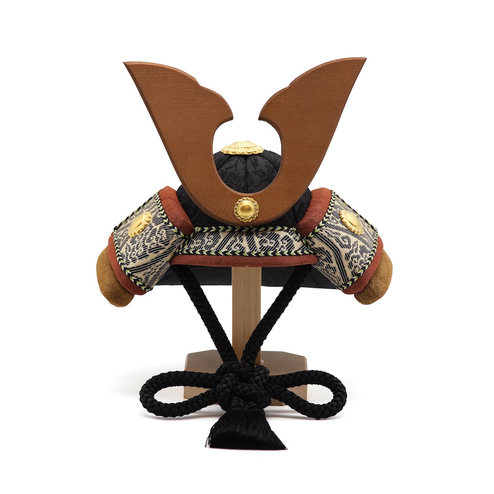 明るめの二色の茶色を中心に黒、グレー、生成り色と温かな印象でまとめた木目込み兜。国内最高品質の正絹を使用し仕上げています。吹き返しには生命力や繁栄を意味する古来から日本の伝統柄として用いられてきた唐草柄。忍緒には総角(あげまき)結びの黒の忍緒を合わせ、洗練された印象に。