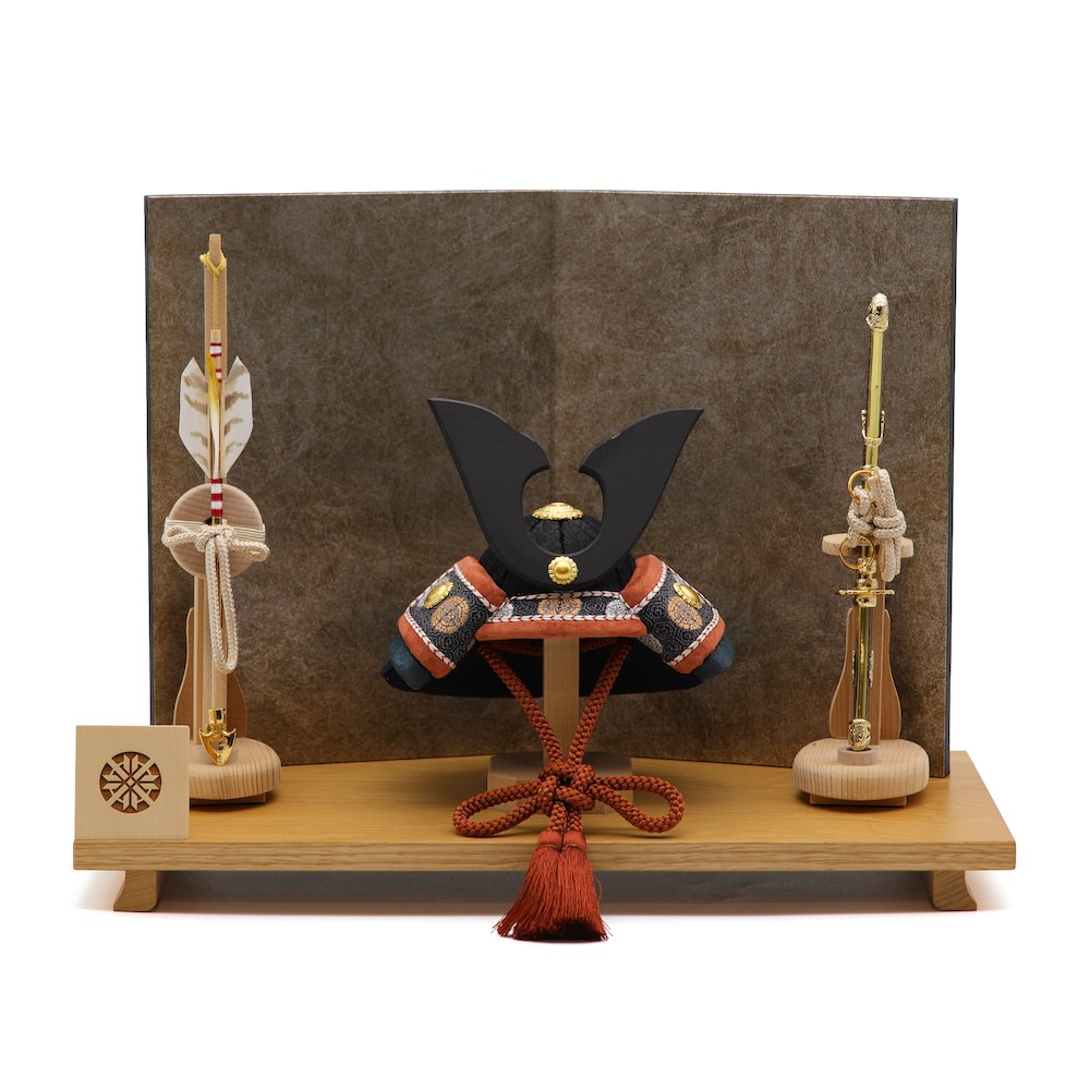飾り台は、木目が美しい栓の木で製作したの国産飾り台。ナチュラルな雰囲気が魅力です。飾り台に合わせた屏風は、兜と飾り台に合わせて用意した特別な品。茶と銀の中間色、ざらっとした質感が特徴的な荒振り屏風。静岡県にて製作したこだわりの品です。一枚一枚手作業で配置していることから独特の美しさと屏風ごとの若干の個体差がございます。
