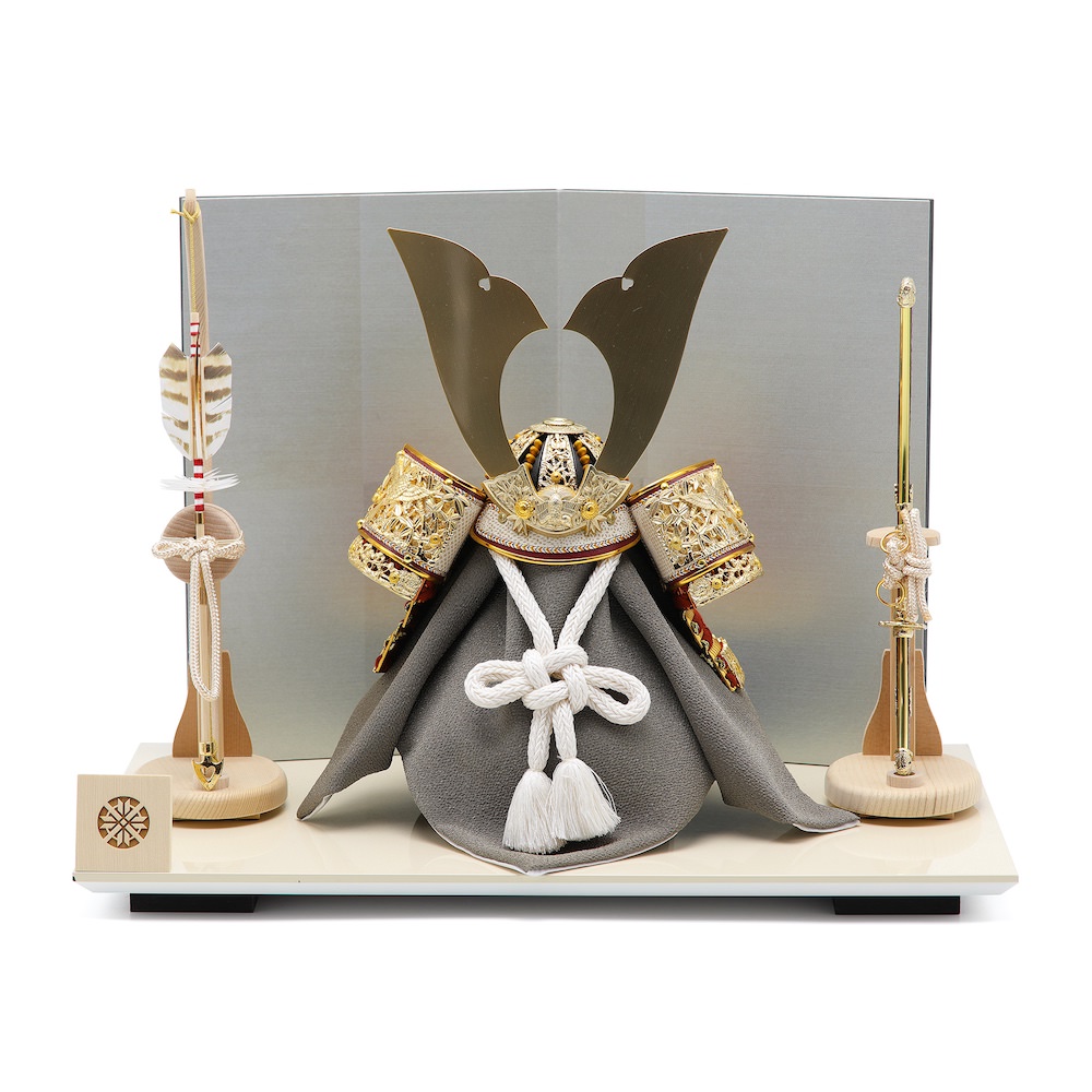 兜から小物まで全て国内の熟練職人の手で製作されたこだわりの品を選定しています。飾り台は富山県高岡漆器と同様の高級高岡塗りにて製作した白塗りの飾り台。屏風は、現代的な銀色とごく薄い青の中間色のような光沢ある屏風。静岡県にて製作したこだわりの品です。