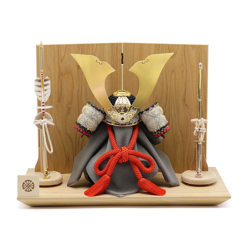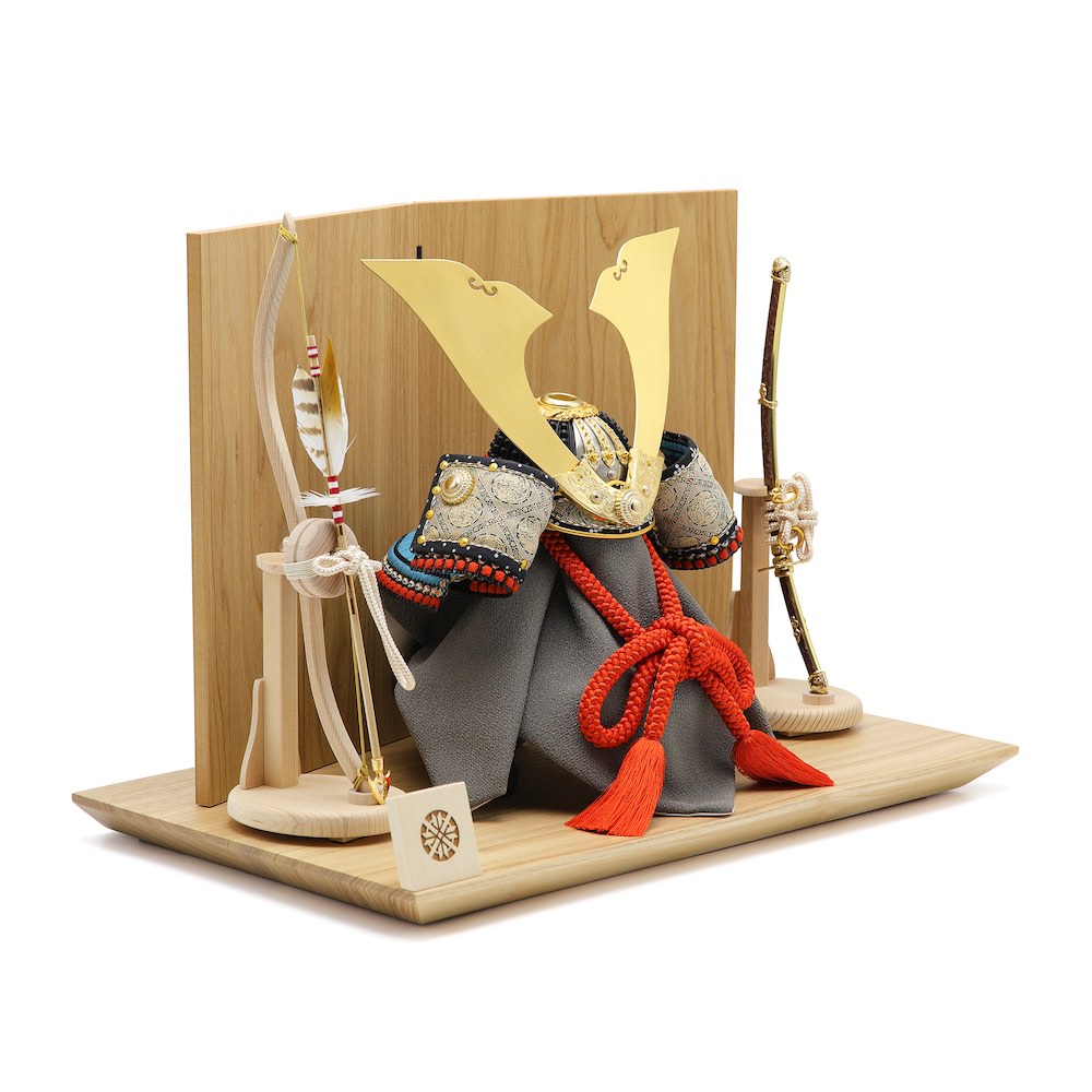 兜から小物まで全て国内の熟練職人の手で製作されたこだわりの品を選定しています。飾り台はタモの木で製作した木目が美しい木製飾り台、屏風も飾り台と全く同じ製法で製作した二曲屏風です。統一感があり、兜の存在が際立つスタイリッシュな品です。